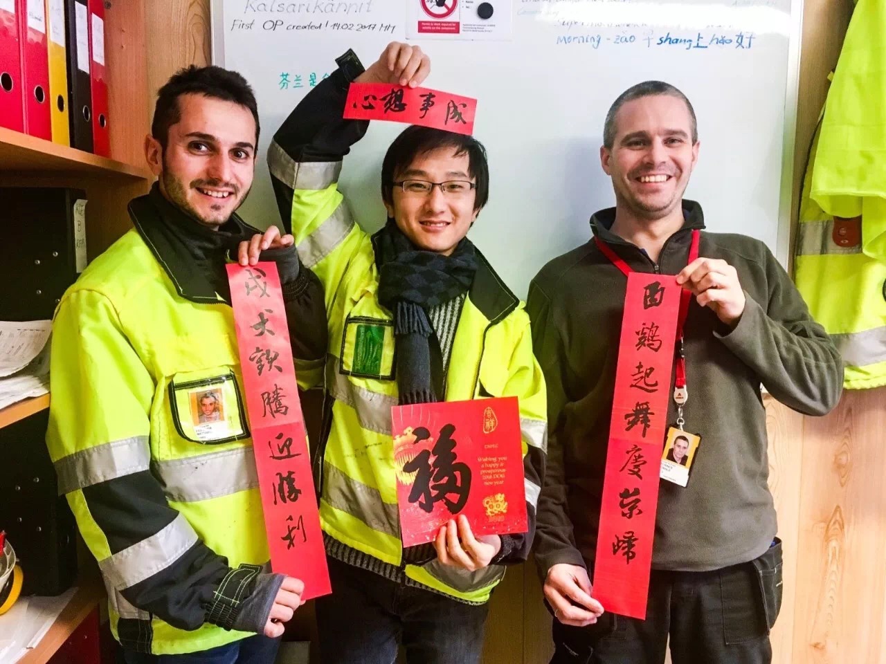 除夕當(dāng)天,他們?yōu)橥瑯訆^戰(zhàn)在芬蘭核電現(xiàn)場的國際同仁送去來自中國春節(jié)的祝福。自制的福字與春聯(lián)為2018的芬蘭項(xiàng)目增添了一份喜慶,一聲祝福,一抹中國紅,老外對(duì)上面的書法與內(nèi)容頗感興趣,但感嘆漢字太過復(fù)雜表示完全看不懂,不過他們高興的接受了這份best wishes。每個(gè)人臉上掛著笑容互相道聲:“Happy Chinese New Year。”