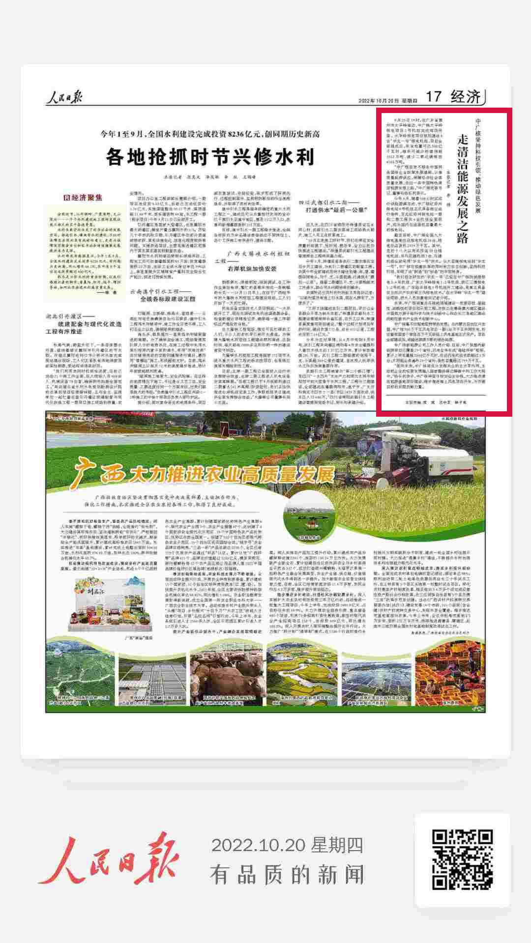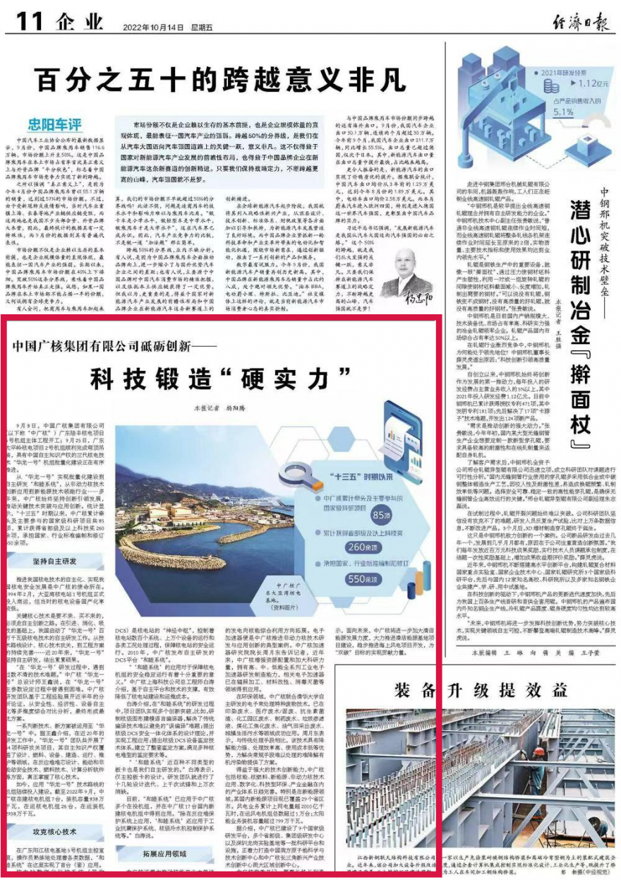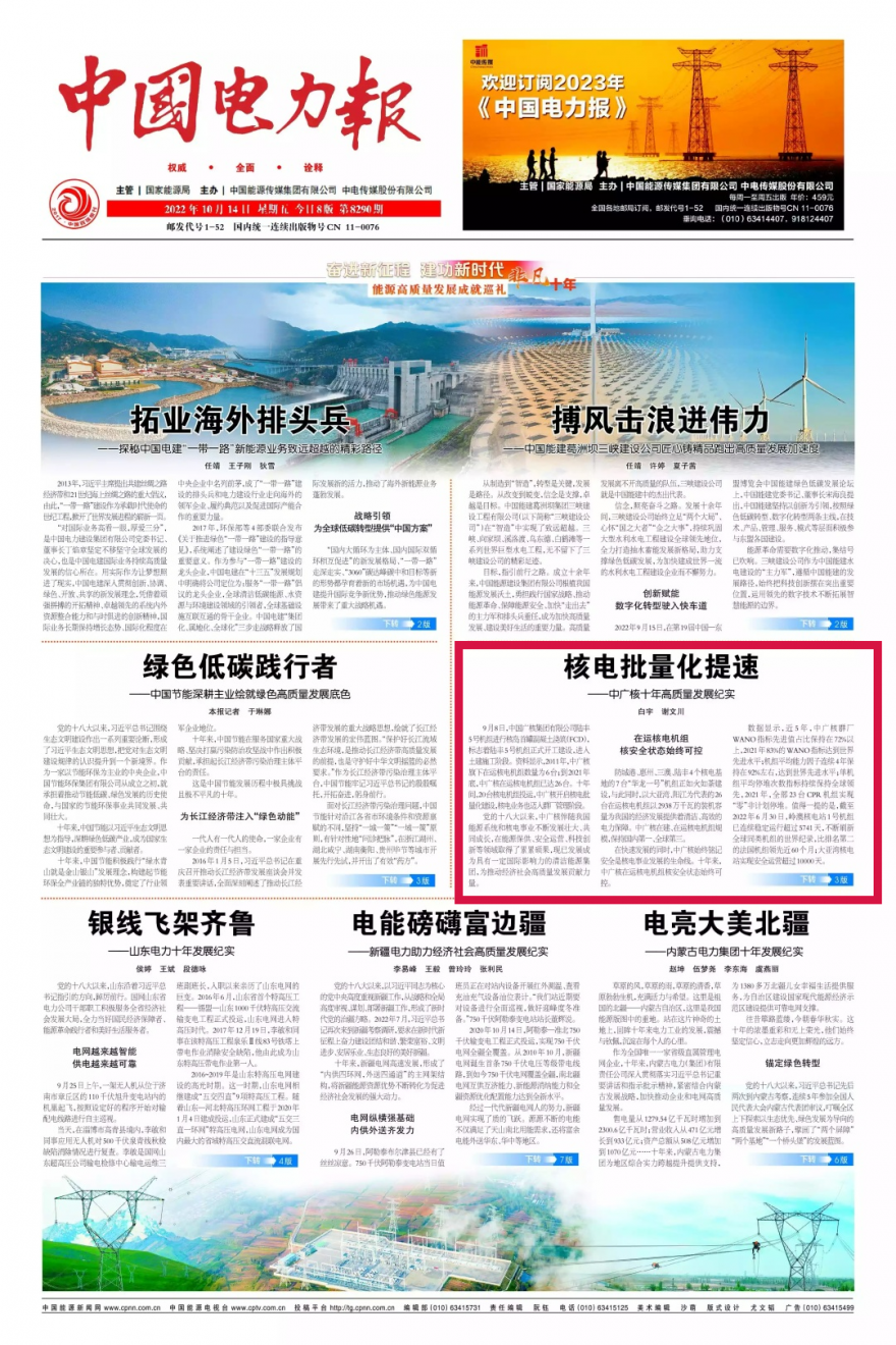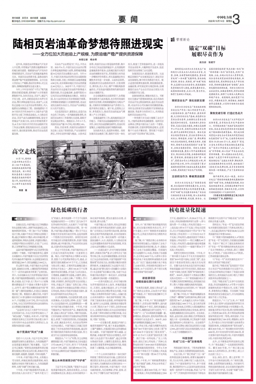 10月20日,人民日?qǐng)?bào)以《走清潔能源發(fā)展之路》為題,聚焦報(bào)道中廣核堅(jiān)持科技引領(lǐng)、推動(dòng)綠色發(fā)展所取得的一系列成績(jī)。經(jīng)濟(jì)日?qǐng)?bào)、中國(guó)電力報(bào)等媒體聚焦報(bào)道中廣核近十年來(lái)在科技創(chuàng)新、核電批量化建設(shè)等方面的發(fā)展成果。