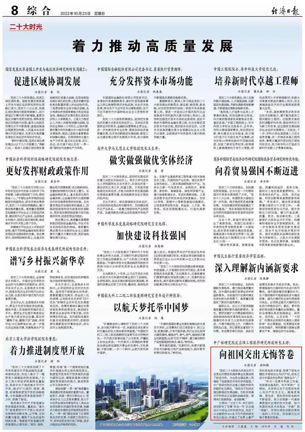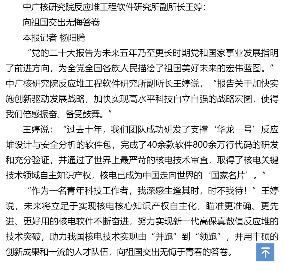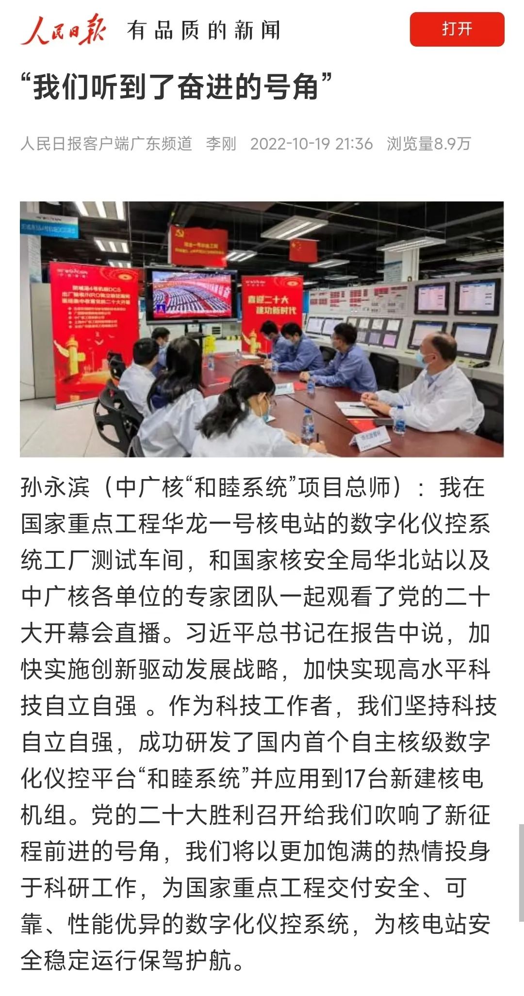 10月16日,黨的二十大勝利召開(kāi),中國(guó)廣核集團(tuán)迅速掀起學(xué)習(xí)宣傳貫徹黨的二十大精神熱潮,習(xí)近平總書(shū)記所作報(bào)告,在中廣核廣大干部員工中持續(xù)引發(fā)熱烈反響。大家表示,將結(jié)合黨的二十大報(bào)告,積極拓寬發(fā)展新思路,堅(jiān)定信心,腳踏實(shí)地向前進(jìn),堅(jiān)持高質(zhì)量技術(shù)創(chuàng)新,投身關(guān)鍵核心技術(shù)攻關(guān),為加快實(shí)現(xiàn)高水平科技自立自強(qiáng)不懈奮斗。