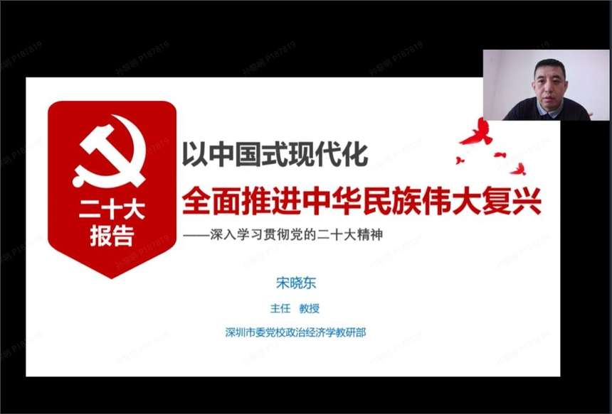 宋曉東以《以中國(guó)式現(xiàn)代化全面推進(jìn)中華民族偉大復(fù)興——深入學(xué)習(xí)貫徹黨的二十大精神》為主題,從大會(huì)主題、大會(huì)背景、全面構(gòu)建社會(huì)主義現(xiàn)代化強(qiáng)國(guó)的宏偉藍(lán)圖、著力推動(dòng)高質(zhì)量發(fā)展的核心要義、努力構(gòu)建新發(fā)展格局的先行示范等角度,深刻闡述了黨的二十大報(bào)告的重大意義、核心要義和豐富內(nèi)涵。