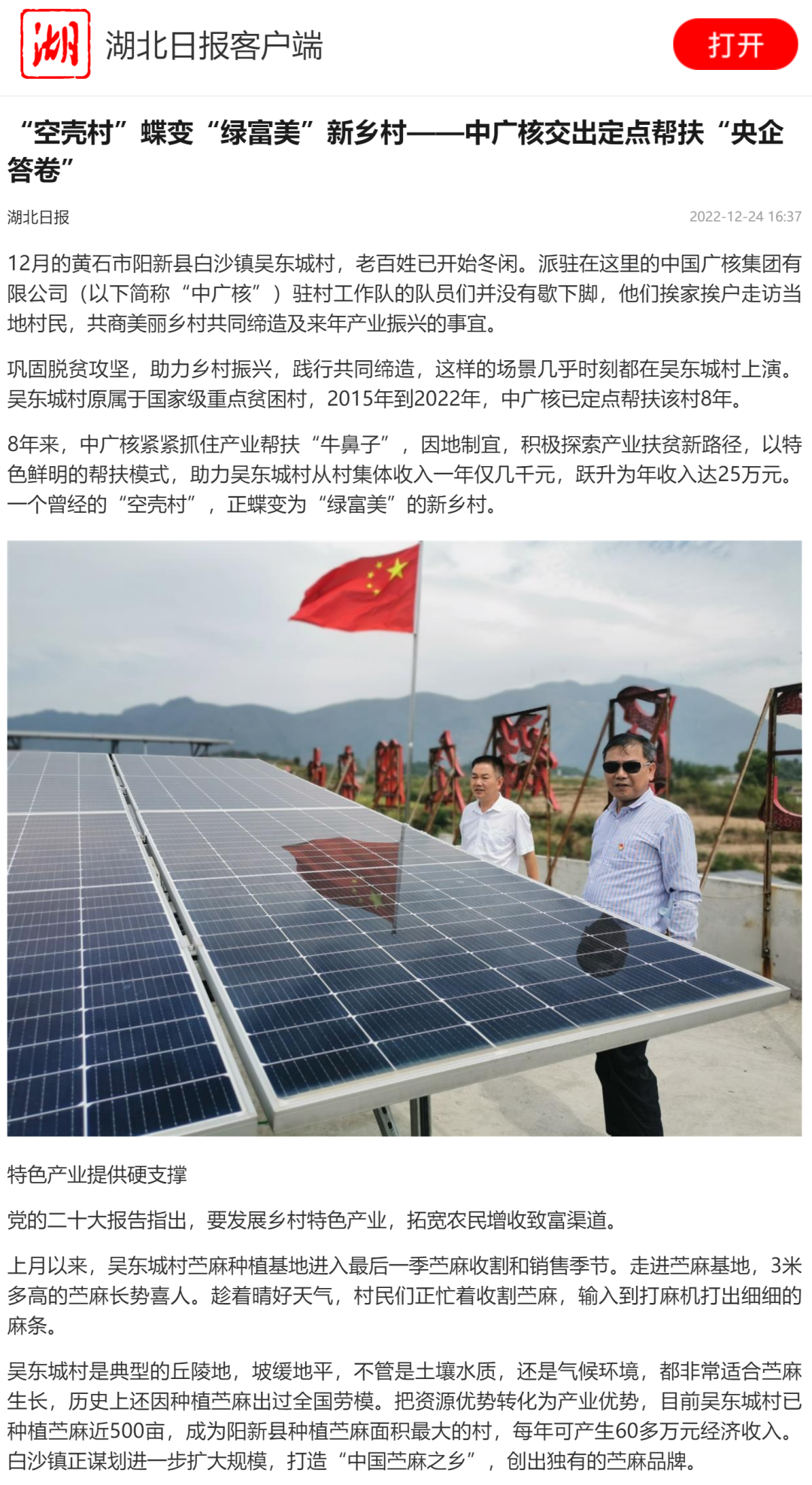 近日,湖北日報聚焦報道,中國廣核集團從2015年到2022年定點幫扶湖北省黃石市陽新縣白沙鎮(zhèn)吳東城村,積極探索產業(yè)扶貧新路徑,以特色鮮明的幫扶模式助力吳東城村脫貧攻堅,從“空殼村”變成“綠富美”新鄉(xiāng)村。