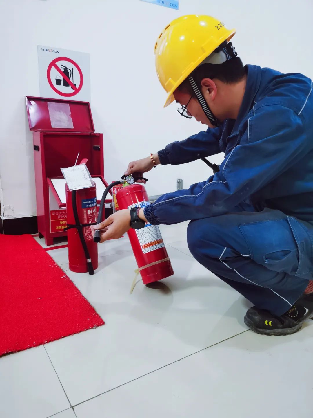 ▲董翱在檢查消防器材