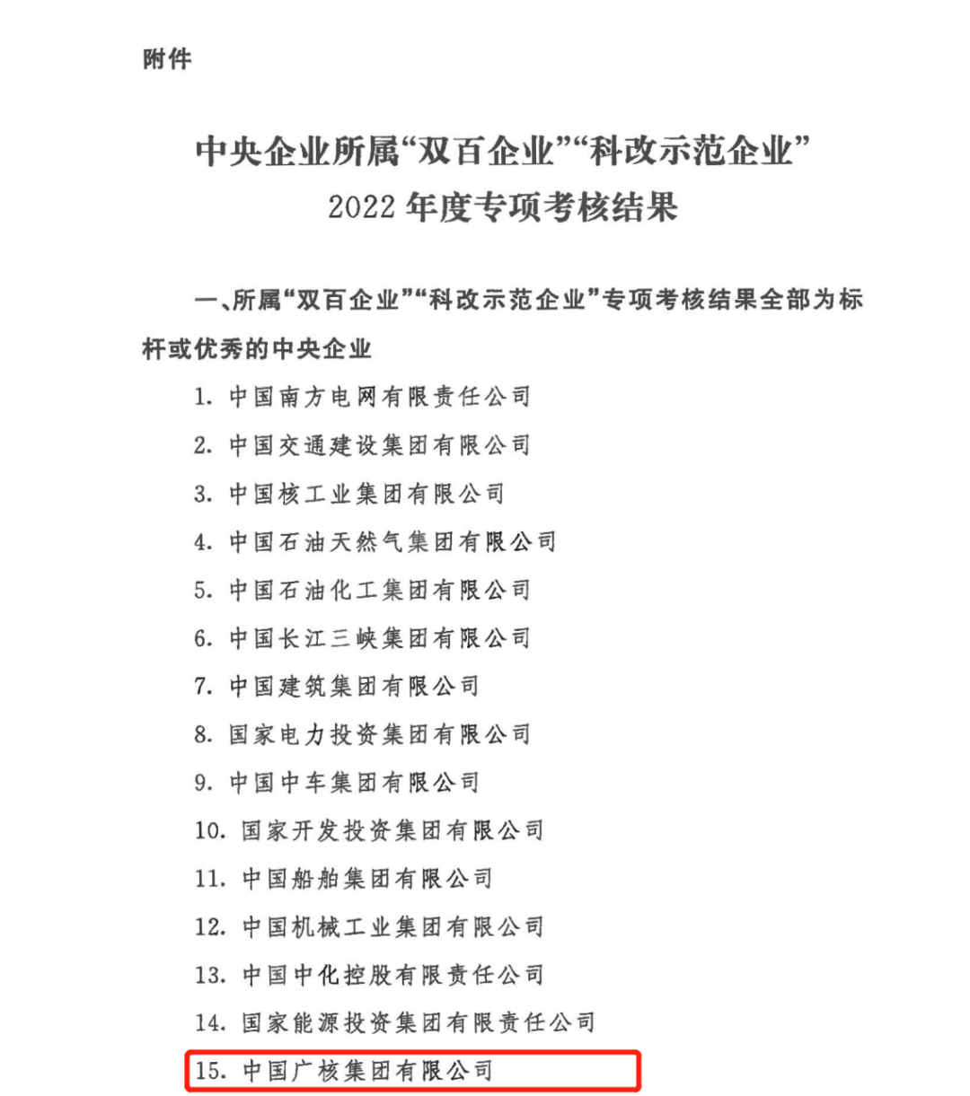 近日,國務(wù)院國有資產(chǎn)監(jiān)督管理委員會組織對中央企業(yè)所屬“雙百企業(yè)”“科改示范企業(yè)”2022年度改革創(chuàng)新情況進行專項考核,并正式印發(fā)《中央企業(yè)所屬“雙百企業(yè)”“科改示范企業(yè)”2022年度專項考核結(jié)果》,中國廣核集團旗下8家試點企業(yè)獲評“3標(biāo)桿”“5優(yōu)秀”的良好成績,專項考核綜合排名位居央企第15位。