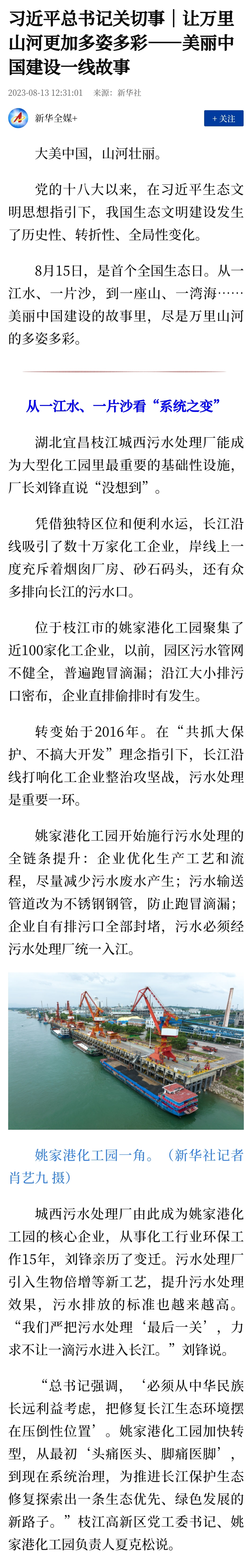 8月13日,在首個(gè)全國生態(tài)日到來前夕新華社刊發(fā),《新時(shí)代新征程新偉業(yè)·習(xí)近平總書記關(guān)切事丨讓萬里山河更加多姿多彩——美麗中國建設(shè)一線故事》,報(bào)道中講述了中廣核湖北宜昌枝江城西污水處理廠引入生物倍增等新工藝提升污水處理效果,成為大型化工園區(qū)最重要的基礎(chǔ)性設(shè)施,助力長江流域生態(tài)保護(hù)修復(fù)。