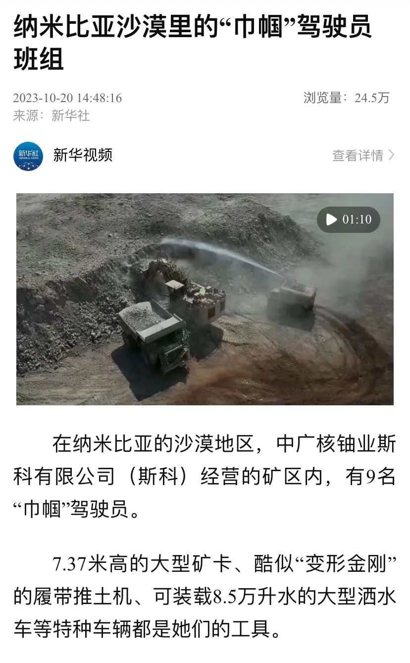 10月20日,新華社刊發(fā)《納米比亞沙漠里的“巾幗”駕駛員班組》,為我們展現(xiàn)了“巾幗”駕駛員在一線工作的颯爽英姿。