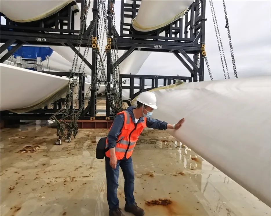 ▲陳少陽驗收檢查到港風(fēng)機葉片