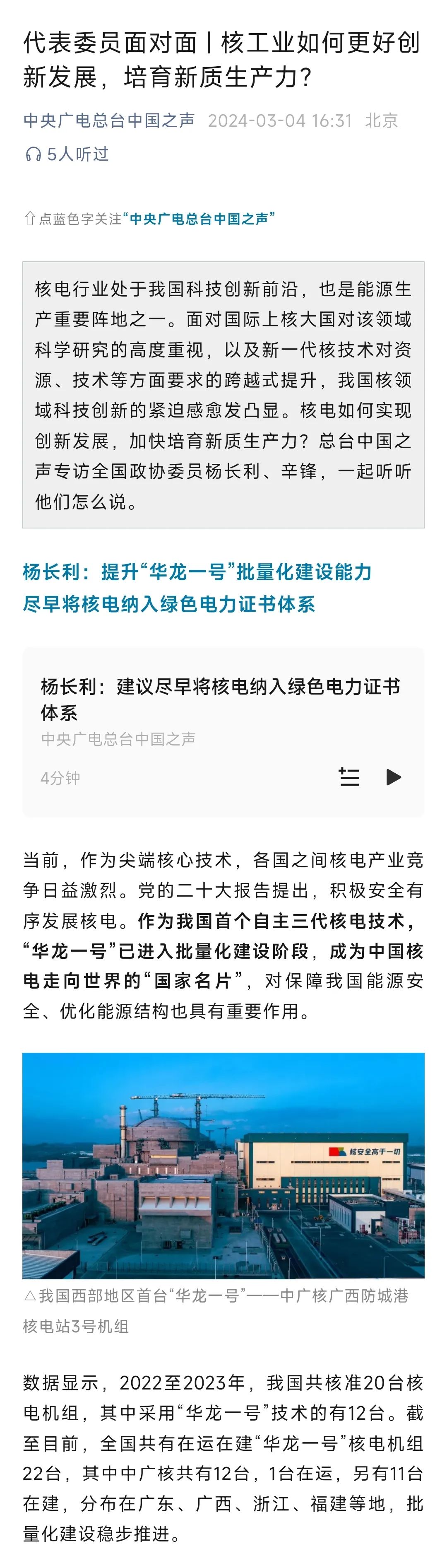 并向大會(huì)提交了《關(guān)于將核電納入我國綠色電力體系的提案》