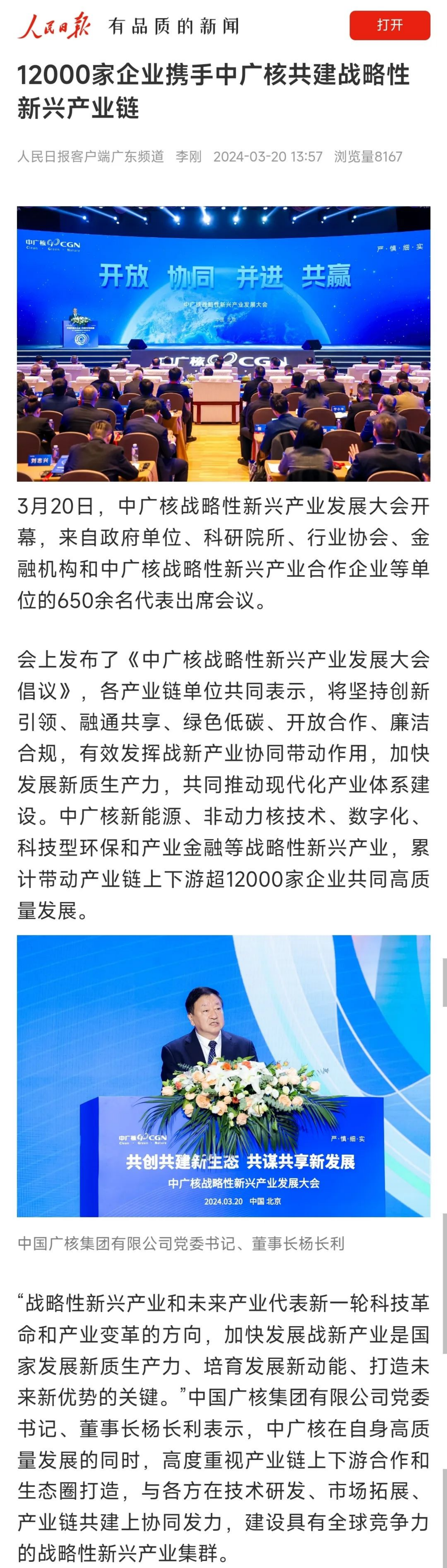 中廣核新能源、非動(dòng)力核技術(shù)、數(shù)字化、科技型環(huán)保和產(chǎn)業(yè)金融等戰(zhàn)略性新興產(chǎn)業(yè),已累計(jì)帶動(dòng)產(chǎn)業(yè)鏈上下游超12000家企業(yè)共同高質(zhì)量發(fā)展。人民日報(bào)、新華社等主流媒體聚焦報(bào)道。
