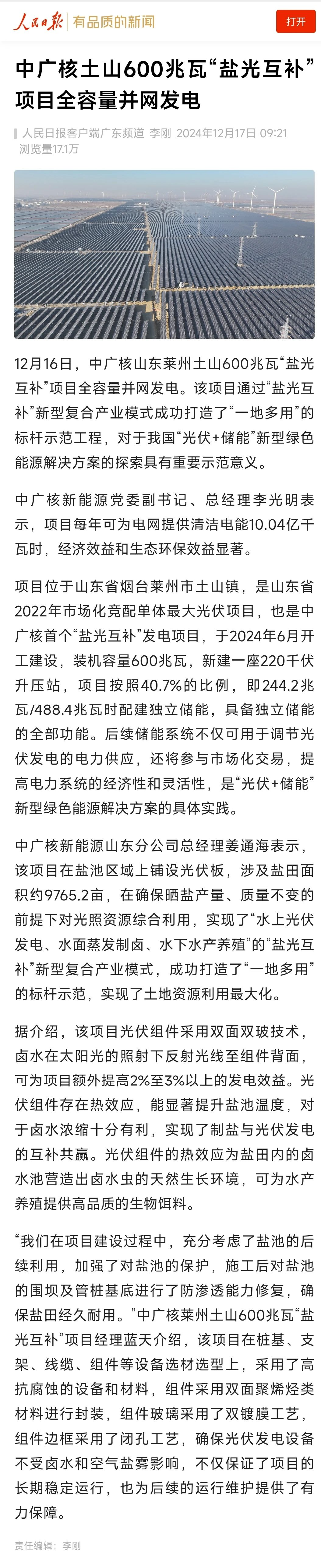 ▲人民日報報道中廣核首個“鹽光互補”項目全容量并網發(fā)電