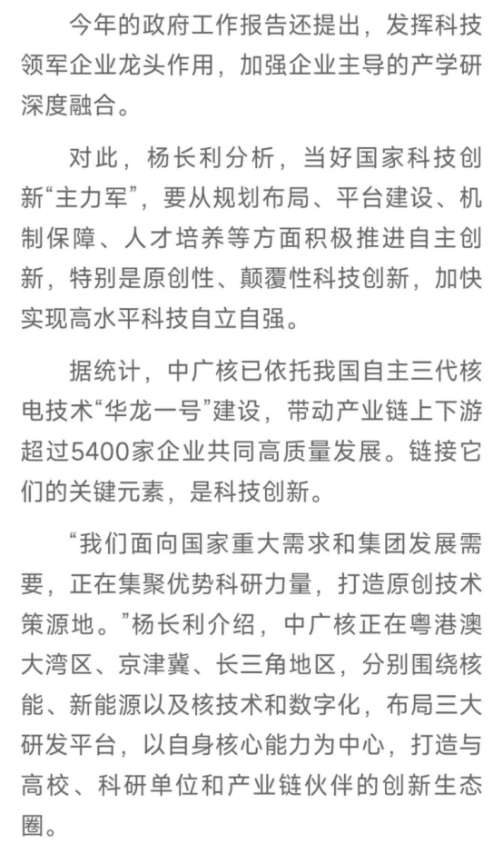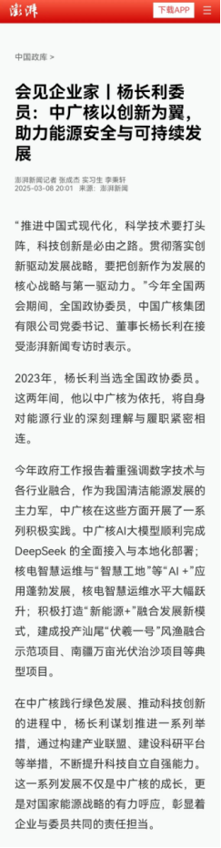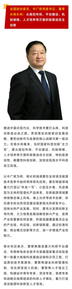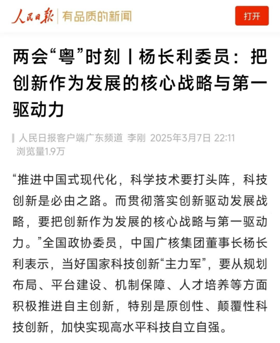 2025年全國(guó)兩會(huì)期間,全國(guó)政協(xié)委員、中國(guó)廣核集團(tuán)有限公司黨委書(shū)記、董事長(zhǎng)楊長(zhǎng)利積極履職盡責(zé),圍繞科技創(chuàng)新、清潔能源融合發(fā)展以及人工智能技術(shù)應(yīng)用落地等熱點(diǎn)問(wèn)題積極發(fā)聲,人民日?qǐng)?bào)、新華社、中央廣播電視總臺(tái)新聞聯(lián)播、科技日?qǐng)?bào)等多家媒體關(guān)注和報(bào)道,產(chǎn)生廣泛的社會(huì)影響。