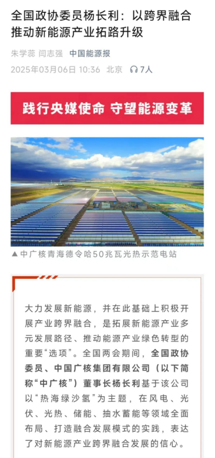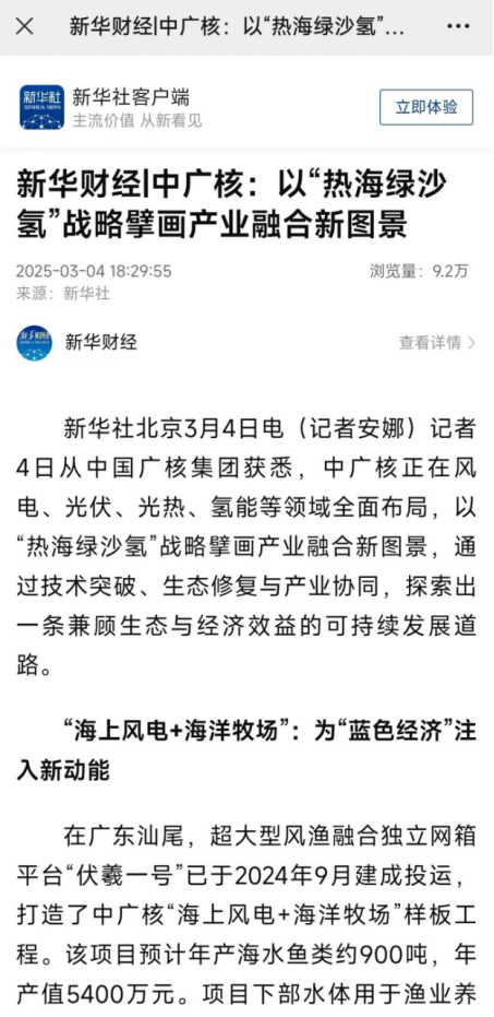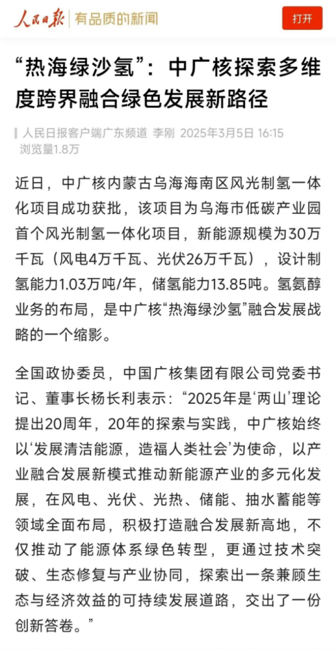 《人民日?qǐng)?bào)》:中廣核正在風(fēng)電、光伏、光熱、氫能等領(lǐng)域全面布局,以“熱海綠沙氫”戰(zhàn)略擘畫(huà)產(chǎn)業(yè)融合新圖景,通過(guò)技術(shù)突破、生態(tài)修復(fù)與產(chǎn)業(yè)協(xié)同,探索出一條兼顧生態(tài)與經(jīng)濟(jì)效益的可持續(xù)發(fā)展道路。