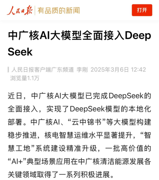 《新華財(cái)經(jīng)》:人工智能是今年兩會(huì)期間的熱點(diǎn)話題。“中廣核AI大模型已完成DeepSeek的全面接入,實(shí)現(xiàn)了DeepSeek模型的本地化部署。同時(shí),一系列核電特種機(jī)器人正在核電建造、運(yùn)維等領(lǐng)域大顯身手?!睏铋L(zhǎng)利說(shuō),后續(xù)中廣核將進(jìn)一步探索人工智能與核電、新能源場(chǎng)景的深度融合,持續(xù)提升生產(chǎn)安全與效率。