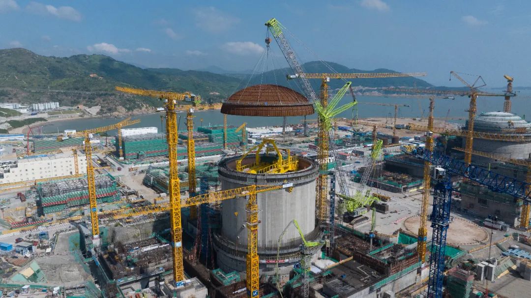 ▲中廣核浙江三澳核電項(xiàng)目一期工程“華龍一號(hào)”穹頂?shù)跹b現(xiàn)場